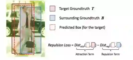 在当前最优的检测框架中,边界框回归技术常用来定位物体,其中回归器被训练用来缩小 proposal 和 groundtruth box 之间的差距(通过一些距离度量进行测量,比如 Smooth_L1 或者 IoU)。尽管如此,现有方法只需要 proposal 接近其指定目标,并不考虑周遭的物体。如图 1 所示,在标准的边界框回归损失中,当预测框移向周遭物体时,对其并没有额外的惩罚。这不免使人设想:如果要检测人群之中的一个目标,是否应该考虑其周遭物体的定位?