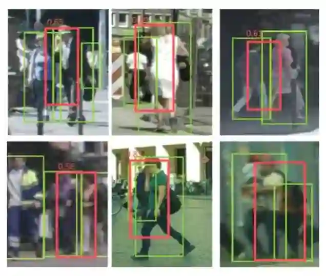 如图 4 所示,绿框是正确的预测边界框,而红框是由密集遮挡造成的误检,并给出了检测器的置信值。如果预测框轻微或显著移向相邻的非目标 groundtruth 物体(比如右上图),或者框定若干个彼此遮挡物体的重叠部分(比如右下图),则经常出现检测错误。此外,密集遮挡引起的检测错误通常有着较高的置信度,从而造成高排名的误检。这表明为提高检测器在密集场景中的鲁棒性,需要在执行边界框回归时有更具判别力的损失。下面是另一个可视化实例:
