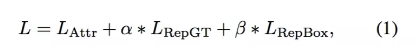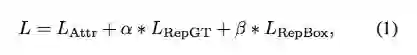 其中 L_Attr 是吸引项,需要预测框靠近其指定目标;L_RepGT 和 L_RepBox 是排斥项,分别需要预测框远离周遭其他的 groundtruth 物体和其他指定目标不同的预测框。系数 α 和 β 充当权重以平衡辅助损失。