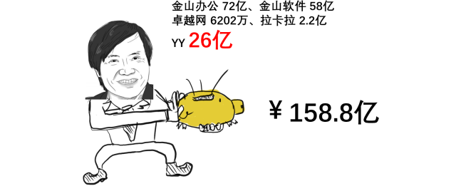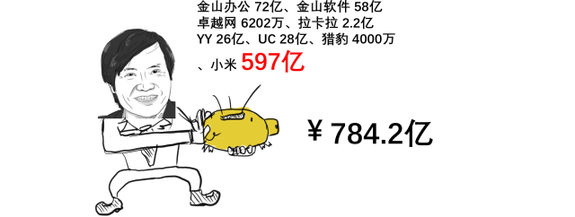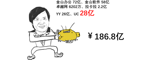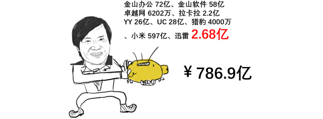 2010年,金山软件与可牛杀毒联合创办了金山网络公司,后来金山网络改名猎豹科技,并在2014年5月上市,2017年猎豹年报显示雷军持有1.2%的股份,截至目前猎豹的市值为 4.72亿美金,雷军这笔股份价值大概 4千万人民币。