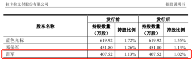 2004年,雷军还投资了支付公司拉卡拉50万美元,2019年4月拉卡拉在A股上市,按照招股书的信息,雷军占股