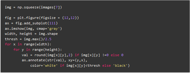 上述代码将数字'3'图像分解为像素。在一组手写数字中,随机选择“3”。并且将实际像素值(0-255 )标准化,并将它们限制在0到1的范围内。归一化的操作能够加快模型训练收敛速度。