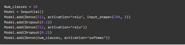 上面的代码片段是使用Keras框架实现(暂时忽略语法错误),该代码表明第一个隐藏层中有512个神经元,连接到维度为784的输入层。隐藏层后面加一个dropout层,丢弃比例设置为0.2,该操作在一定程度上克服过拟合的问题。之后再次添加第二个隐藏层,也具有512谷歌神经元,然后再添加一个dropout层。最后,使用包含10个类的输出层完成模型构建。其输出的向量中具有最大值的该类将是模型的预测结果。