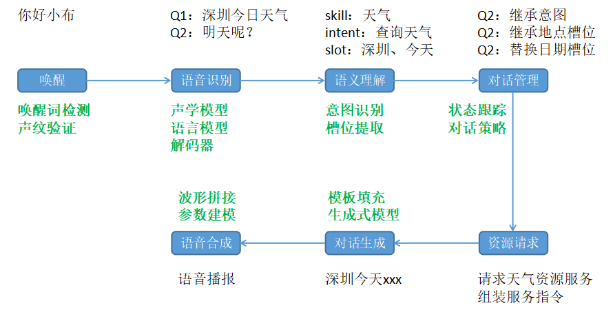 工业界在 AI 算法领域的优势和便利吸引杨振宇投身企业。他入职 OPPO 后,带领团队主导小布助手 NLP 与对话算法能力的建设。作为对话式 AI 产品,小布助手的交互流程与行业主流产品一致,由唤醒、语音识别、语义理解、对话管理、对话生成,以及语音播报多个环节组成。