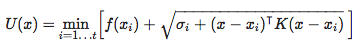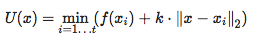 但是,如果你想在实践中使用LIPO,还需要解决一些问题。这篇文章接下来的部分讨论了这些问题以及dlib实现如何解决这些问题。首先,如果 f(x) 有噪声或不连续,即使只有一点点,它也不能可靠地工作,因为k会变成无穷大。在现实世界的问题中总是会发生这种情况。其次,并不是所有的超参数都同等重要,有些参数几乎没有关系,而另一些参数的一点小变化都会对 f(x)的输出影响很大。所以如果每个超参数都有自己的k,那会很好。你可以通过定义上界U(x) 来解决这些问题,如下所示: