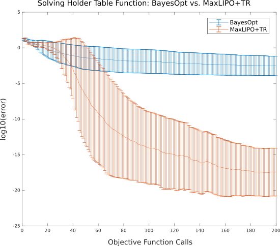 将MaxLIPO和Powell置信区间综合方法(MaxLIPO+TR,红色)与MATLAB贝叶斯优化工具的默认设置(蓝色)相比较,贝叶斯优化在±10的-3次方精度趋于停滞,而混合方法很快就降到了±10的-17次方浮点精度。