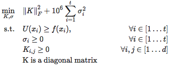 σ²上的的penalty使得大多数σ项恰好为0。整个算法的表现对于这里使用的特定penalty的值是不敏感的,只要它大得合理,那么大部分时间σ值都是0,同时仍然阻止k变成无限,这是我们想要的。也可以将它重写为一个大的二次规划问题,并用双坐标下降法来解决这个问题。这里就不再详细讨论。