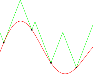 所以当我读到Cédric Malherbe和Nicolas Vayatis在去年的机器学习国际会议上发表的Global optimization of Lipschitz functions这篇论文时,我非常兴奋。在这篇论文中,他们提出了一个非常简单的无参数、而且经证明有效的方法来寻找使函数f(x)最大化的,即使 f(x)有多个局部极大值。论文中的关键思想是保持f(x)的分段线性上界,并用它来决定在每个优化步骤中用于评估的x。因此,如果你已经评估了点x₁,x₂,...,xt,那么您可以在 f(x)上定义一个简单的上界,如下所示: