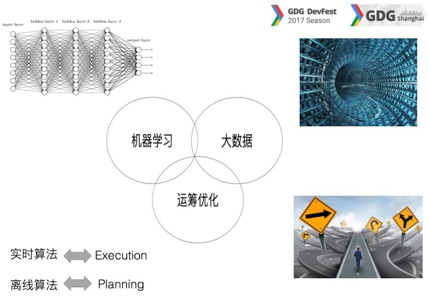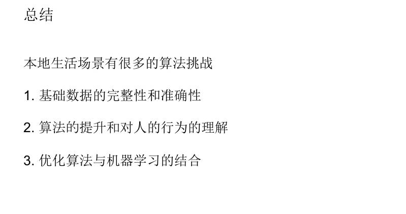 第三点优化算法与机器学习在我们行业是相辅相成的,不仅是机器学习,更重要的是我们在这么短时间怎么样把人力分布最好,在最少的时间情况下把订单完成。