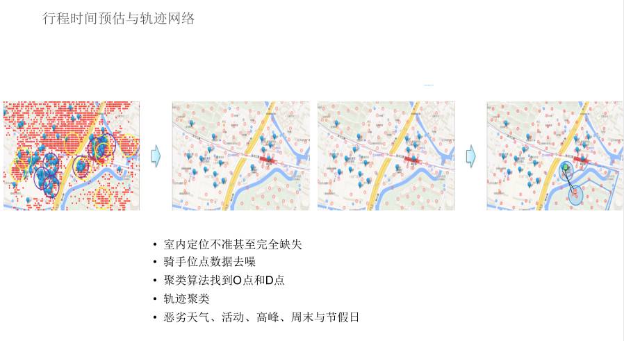 其次,即使定位有了,它的位点也是有 GPS 轨迹的,也有很多的噪音,所以需要去噪。我们通过定位的算法把相关的时间,把 O 点和 D 点合起来,最后进行轨迹聚类。