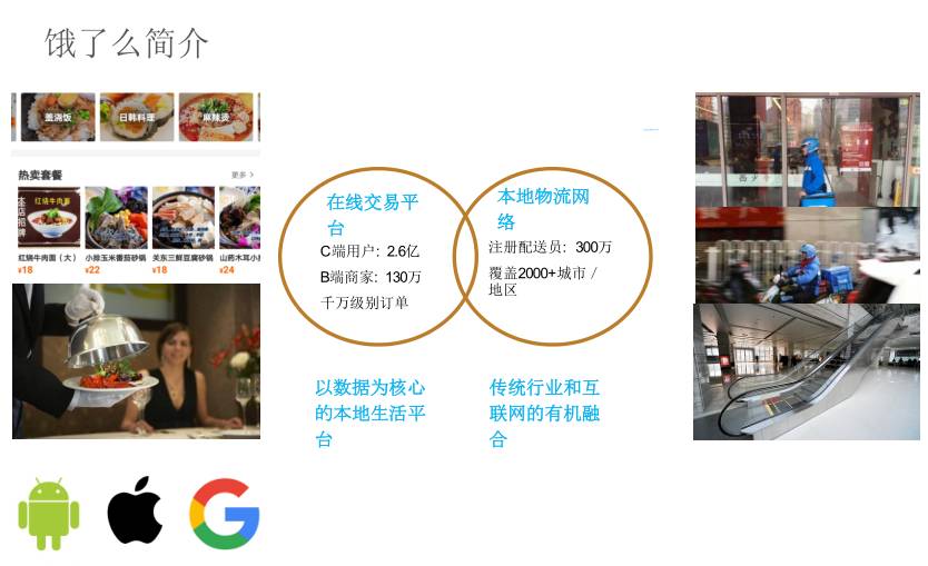 “饿了么”C 端注册用户 2.6 亿,B 端商家目前已经是 130 万,每年是千万级别的定单情况,这个是我们外卖行业的一部分,基于电商交易平台。