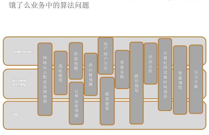 根据上面所述,我们进入了一个大的框架,就是在外卖这个行业是三个大框架,一个是机器学习,一个是大数据,再一个运筹优化跟机器学习也是密不可分的。