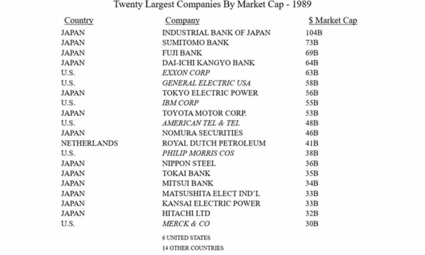 70-80年代是日本经济迅速起飞的阶段,我们可以再看1989年全球上市公司市值TOP20榜单,其中竟有13家公司都来自日本。类比一下,中国企业在未来十至二十年内批量登顶全球企业顶部可以说是一个确定性趋势。