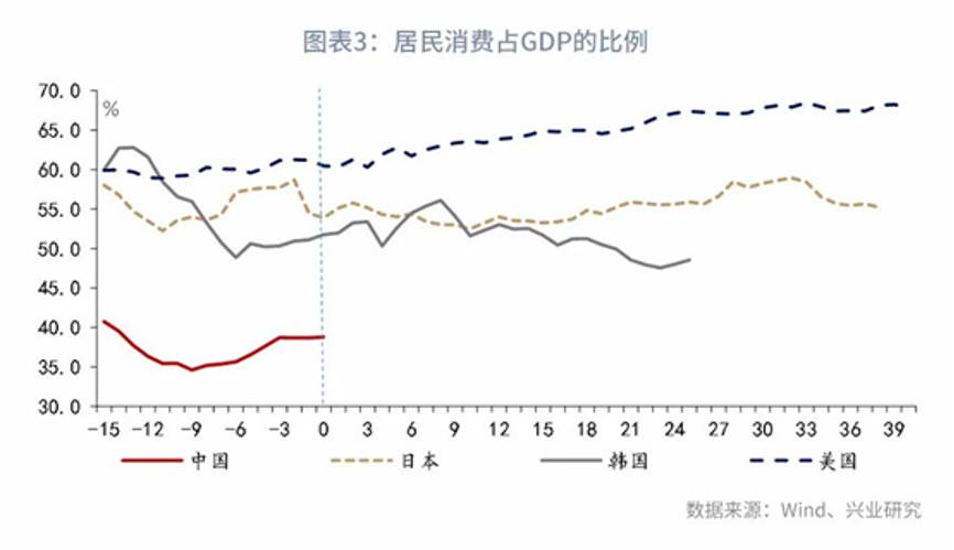 以人均GDP1万美元为节点,美国居民消费GDP占比60.5%,日本和韩国达到53.9%和51.8%,而中国居民消费占GDP比例为38.8%,提升空间巨大。