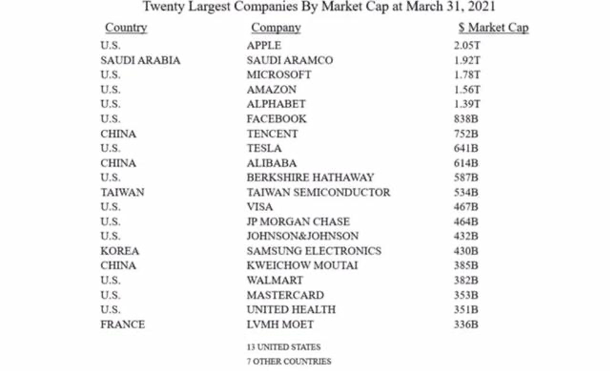 当然,日本的后续大家也知道了,日本经济在90年代初股票和房地产泡沫相继破灭,随后便经历了“失去的三十年”,这也都是后话了,到2021年Q1,全球上市公司市值TOP20中,有13家为美国公司,腾讯、阿里、台积电、茅台四家中国公司入榜。