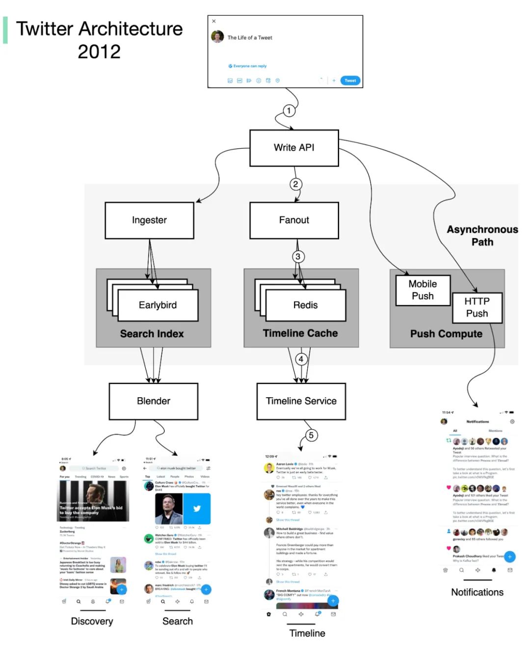 与此同时,也有不少好心的架构师进行了优化与完善。在 Twitter 上,《System Design Interview》的作者 Alex Xu 特别绘制了 Twitter 2022 年与 2012 年不同时期的架构图,可以方便读者更为直观地学习: