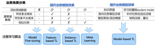 EasyTransfer框架支持所有主流的迁移学习范式,包括Model Fine-tuning, Feature-based TL, Instance-based TL, Model-based TL和Meta Learning。基于这些迁移学习范式开发了10多种算法,在阿里的业务实践中取得了良好效果的效果。后续所有的算法都会开源到EasyTransfer代码库里。在具体应用的时候,用户可以根据下图来选择一种迁移学习范式来测试效果。