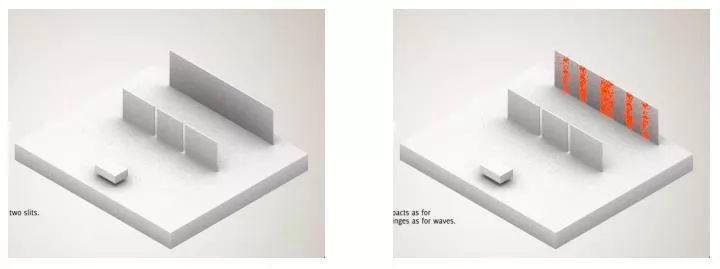 在装置当中,如果我们发射出普通的粒子,比如说棒球,它们一个一个离散地发射出来,可以穿过狭缝,达到后面的挡板上。每个棒球只可能从某一个狭缝中通过。考虑到棒球跟狭缝之间碰撞的影响,最后在后面的挡板上会形成随机的分布。这就是粒子性的体现。