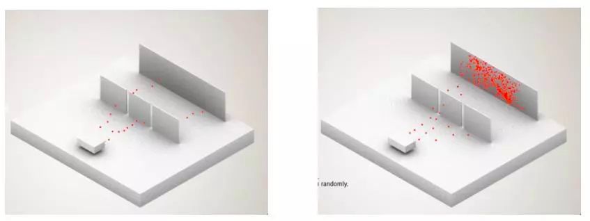 如果在刚才的狭缝前,安装一个探测器,看看电子到底是怎么通过狭缝的,那么我们会发现,它只会通过一个狭缝。而这个时候,最后挡板上呈现的就回到了粒子性的完全随机分布,不再出现明暗条纹了。