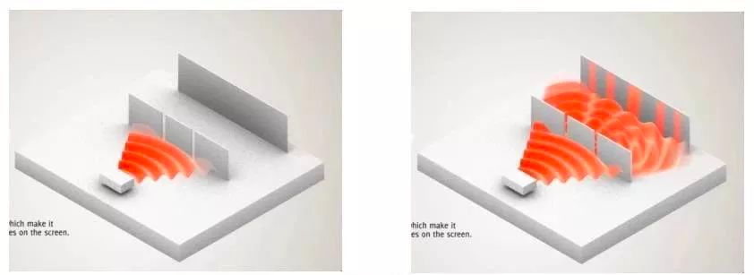 如果我们发射一束波,比如说水波或者声波,它可以同时通过这两个狭缝,然后在后面发生干涉,最后出现在挡板上的就是一个清晰的明暗条纹。这就是波动性的体现。