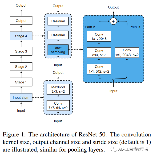 ResNet-B改变的下采样块。观察到路径A中的卷积忽略了输入feature map的四分之三,因为它使用的内核大小为1×1,Stride为2。ResNet-B切换路径A中前两个卷积的步长大小,如图a所示,因此不忽略任何信息。由于第2次卷积的kernel大小为3×3,路径a的输出形状保持不变。