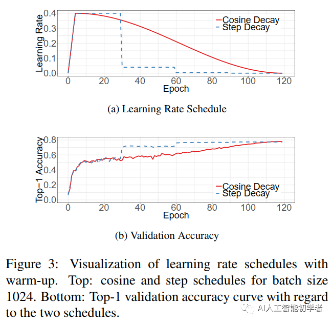 Goyal等人提出了一种Gradual Warmup策略,将学习率从0线性地提高到初始学习率。换句话说,假设将使用前m批(例如5个数据epoch)进行Warmup,并且初始学习率为 ,那么在第 批时 将学习率设为i =m。