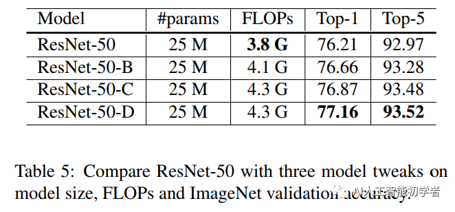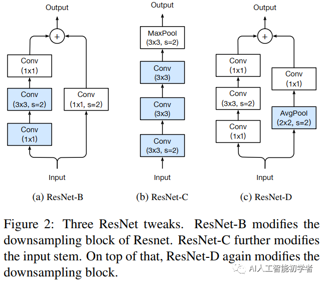 回顾了ResNet的两个比较流行的改进,分别称之为ResNet-B和ResNet-C。在此基础上,提出了一种新的模型调整方法ResNet-D。