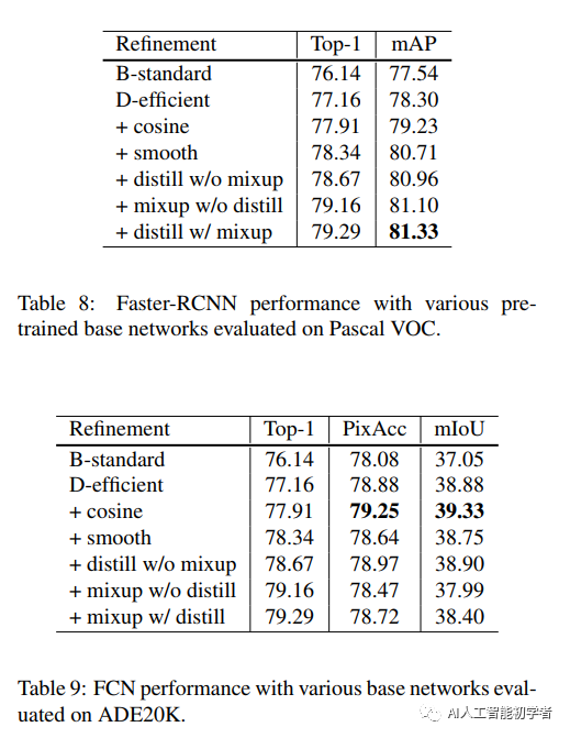 其实图像分类研究取得的大部分进展都可以归功于训练过程的改进,如数据增加和优化方法的改变。但是,大多数改进都没有比较详细的说明。因此作者在本文中测试实现了这些改进的方法,并通过消融实验来评估这些Tricks对最终模型精度的影响。作者通过将这些改进结合在一起,同时改进了各种CNN模型。在ImageNet上将ResNet-50的Top-1验证精度从75.3%提高到79.29%。同时还将证明了提高图像分类精度会在其他应用领域(如目标检测和语义分割)也可以带来更好的迁移学习性能。