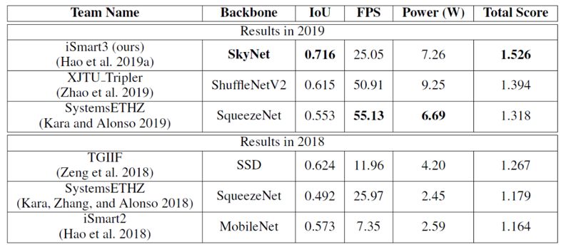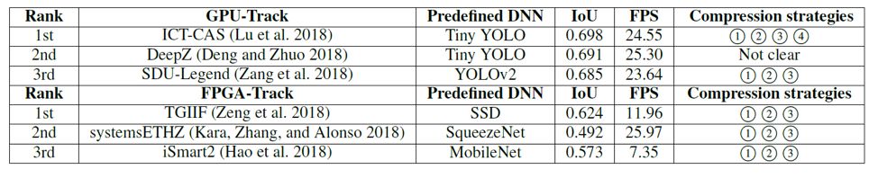 表 1: 2018 年低功耗目标检测系统设计挑战赛前 3 名设计方案分析。所有设计均采用自顶向下的 DNN 设计方法,选取已有网络(predefined DNN)进行模型压缩(Compression)以适应目标硬件平台。这些设计采用的方法有 1input resizing、2 网络剪枝、3 低精度数据量化和 4TensorRT。