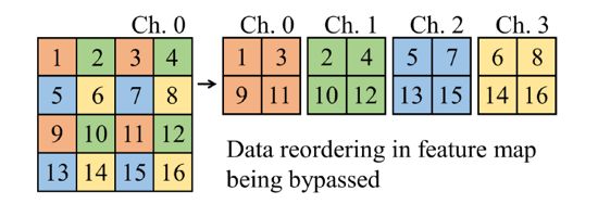 依照自底向上的设计方案,我们设计出 SkyNet 作为参赛模型(图 5)。在设计过程中,被选中的 Bundle 包含了 DW-CONV3x3,CONV1x1,BN 和 ReLU6 这 4 个主要元素。在网络搜索算法堆叠 Bundle 并生成初始 DNN 后,我们对初始网络作了细微的修改,增加了一条用于传送特征图的旁路(bypass,图 5 的橙色连线)。设置旁路的原因在于,我们发现数据集里有 91% 的被测物与输入图片大小之比少于 9%,有 31% 的被测物与输入图片大小之比少于 1%(如图 7 例子)[2]。也就是说,这项比赛任务属于小物体检测任务。所以,我们添加了用于传送浅层特征图到深层卷积的旁路(把第三个 Bundle 的输出直接输入至最后一个 Bundle),减少小物体特征在经过池化层后丢失的机会。由于旁路跨越了池化层,旁路传输的特征图与原输入特征图尺寸并不相同。我们采用特征图重排列(reordering,图 6)去解决这个问题:重新排列经过旁路的特征图,减少其宽和高的同时增加其通道数,并混合不同通道的特征。对比使用池化层,重排列的优势是能在匹配旁路与原输入特征图尺寸的同时,不丢失特征数据。