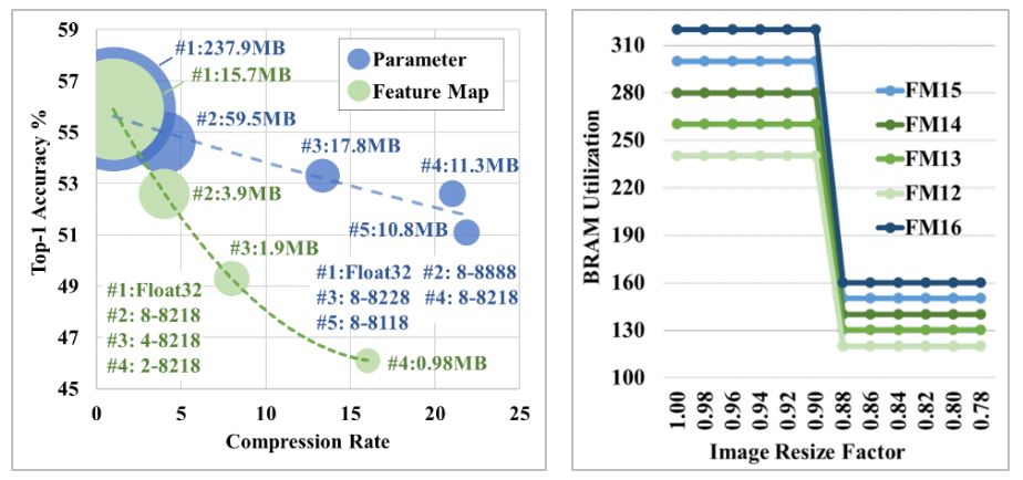 图 3: 左图:对 AlexNet 的权值参数(parameter)和特征图(feature map)作不同比特位宽量化时,相似的压缩比例会引起巨大的推理精度差异(压缩后的网络模型均在 ImageNet 上充分训练);右图:对指定 DNN 的特征图采用 12~16 比特位宽量化以及输入缩放时对应的片上存储器资源开销。在部署该 DNN 到 FPGA 时,把缩放因子从 0.90 降低至 0.88 就能大幅度节省硬件资源,但网络推理精度几乎不变 [1]。