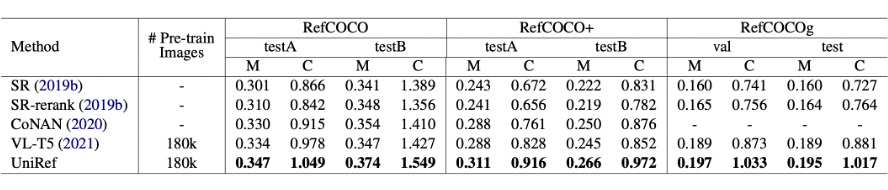 本工作的研究员在三个基准数据集 RefCOCO、RefCOCO+ 和 RefCOCOg 上进行了广泛的实验。实验结果表明,所提出的模型在 REG 和 REC 上都优于以前最先进的方法。