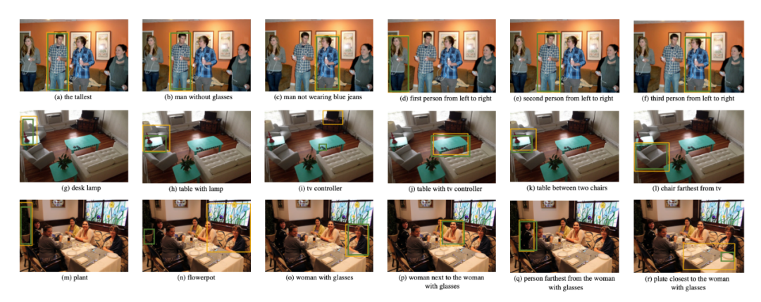 但是 REC 中仍然存在挑战。通过分析不良案例,可以总结出所提出的模型面临的一些困难:1)短路径。该模型正确地定位了植物(m),但未能定位到花盆(n)。它首先定位墙上的花朵,然后将这面墙视为花盆。说明模型并没有真正理解什么是花盆,而是通过花来学习短路径;2)小物件。可以发现该模型对于小物体识别不是很好(i、r)。
