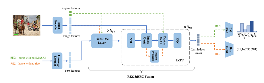 北京邮电大学、字节跳动人工智能实验室以及苏州大学的研究者提出了一个统一的 REG 和 REC 模型(UniRef)。它将这两个任务通过精心设计的图像-区域-文本融合层(Image-Region-Text Fusion layer,IRTF)统一起来,图像-区域-文本融合层通过图像互注意力与区域互注意力来融合图像、区域与文本信息。此外,它可以为 REC 任务生成伪区域输入,以便以统一的方式在 REC 和 REG 之间共享相同的表示空间。