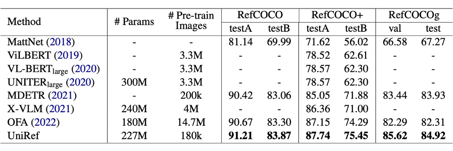 上图可视化了 UniRef 在 REC 中学习的能力,并给出了边界框预测的示例。UniRef 能够处理具有各种属性的描述,例如比较关系(a)、属性识别(b、c)、空间关系(j、k)和计数(d-f)。