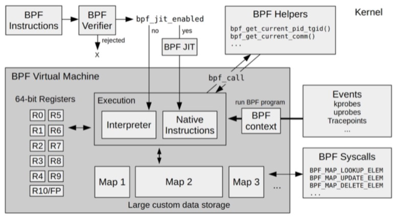 内核验证BPF字节码安全,并且确保对应事件发生时调用正确的eBPF程序,如果有状态需要保存,则写入对应BPF映射中,比如监控数据就可以写到BPF映射中。