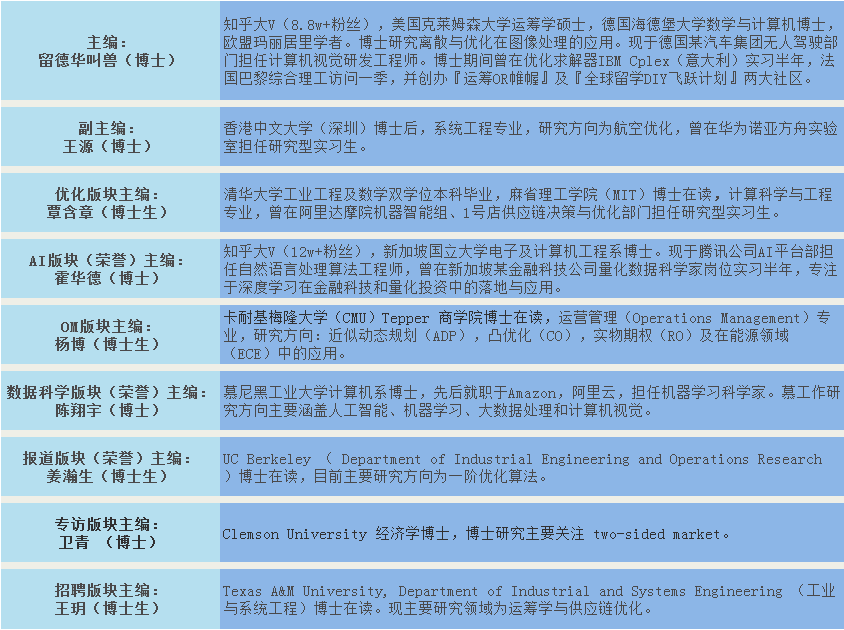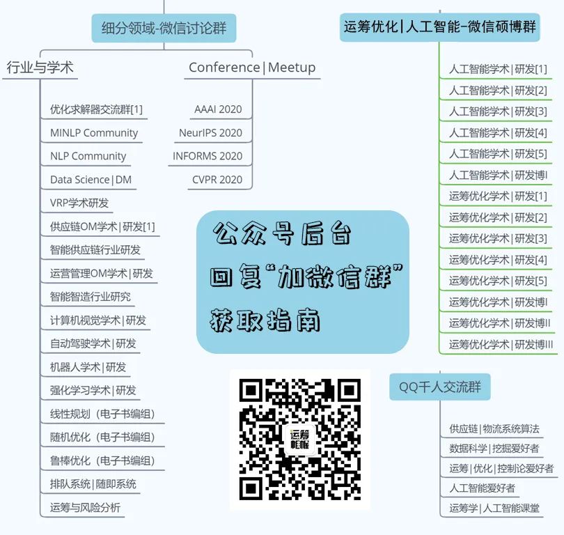 社区旨在为读者带来运筹学|优化理论最专业和前沿的咨询与报道,及其在供应链管理,人工智能等学科的交叉应用。专栏设有优化、OM、AI、DS、专访、报道、招聘等版块,专栏主编多为世界名校OR博士。自2018年创立起,目前『运筹OR帷幄』知乎+公众号+头条号+微信QQ群+知识星球粉丝总量超过30W,细分专业微信硕博群超过30个。