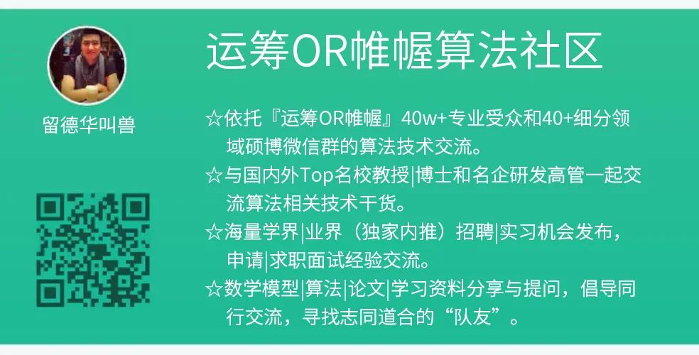 随着算法相关专业热度的提升,考研读博、留学申请、求职的难度也在相应飙升,『运筹OR帷幄』建立了【算法社区】知识星球,涵盖运筹学、数据科学、人工智能、管理科学、工业工程等相关专业,集结社区40W专业受众的力量,提供给大家一个共同的学习交流平台,结交志同道合的伙伴。