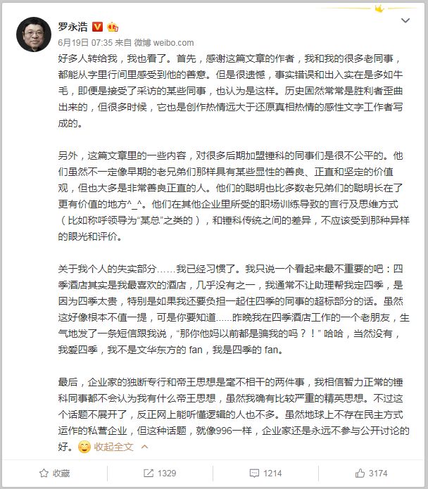 此外,罗永浩还澄清,四季酒店是其最喜欢的酒店,几乎没有之一,通常不让助理帮其定四季是因为四季太贵。