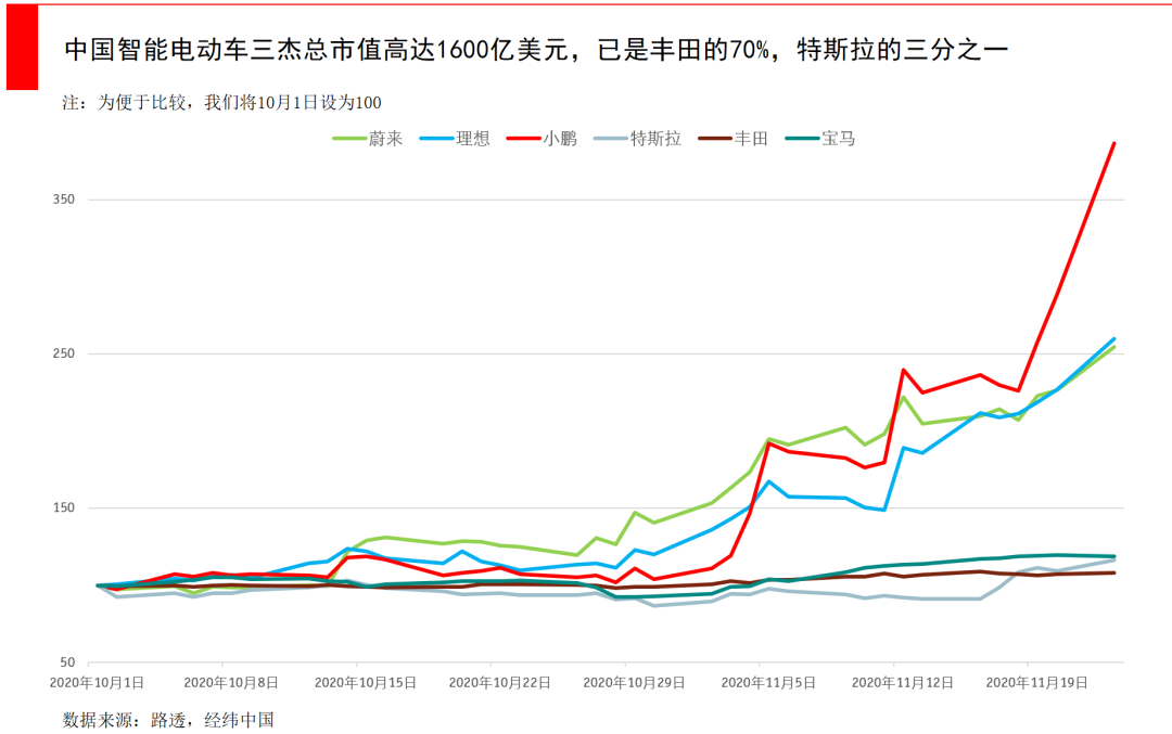 我们自己虽然很看好,对这种短时间内的股价涨幅也十分吃惊。如果硬要寻找理由,那可能跟市场突然认可了电动车的远期潜力、中国和欧洲大力推行电动车替代燃油车、美国下一任总统拜登大力支持新能源、中概股越来越变成了一个外在的“科创板”等等因素有关,但这些都只是事后诸葛亮。