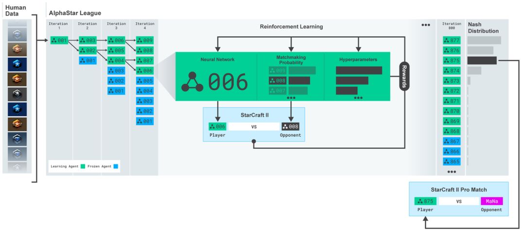 这种新的训练形式,是把从前基于种群(Population-Based)的强化学习思路又深化了一些,制造出一种可以对巨大的策略空间进行持续探索的过程。