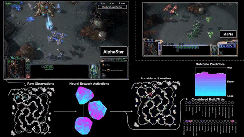 原始的观察里数据输入到神经网络之中,产生一些内部激活,这些激活会转化成初步的决策:该做哪些操作、点击什么位置、在哪建造建筑等等。另外,神经网络还会预测各种操作会导致的结果。