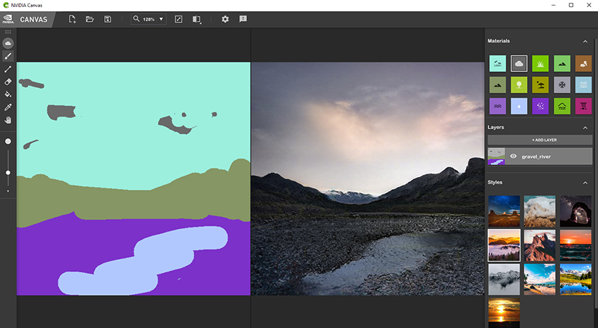 NVIDIA canvas也提供了多种材料可供使用。NVIDIA画布有九种风格,修改的外观和感觉的绘画和15种不同的材料,从天空和山脉,河流和石头。在不同的图层上绘制,使元素保持分离。从头开始,或启动和修改应用程序的预制场景之一,以获得更完美的灵感提示。