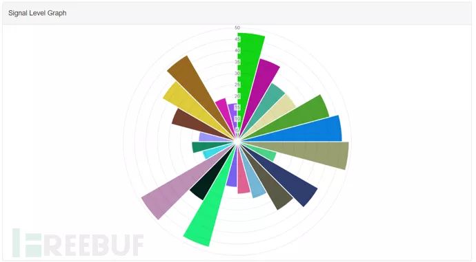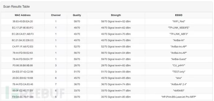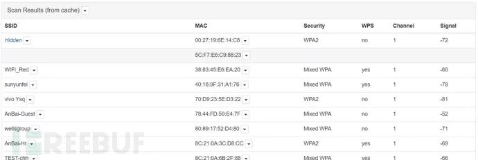 Recon模块采用被动式扫描方式,扫描过程会自动将网卡设置为监听模式,监听周围不同信道上(客户端)发出的各种数据包。能够扫描出SSID、MAC地址、加密方式、是否启用了WPS功能、信道及信号强度等信息,甚至还能扫描出当前未连接任何AP的客户端