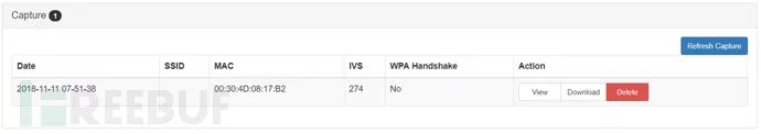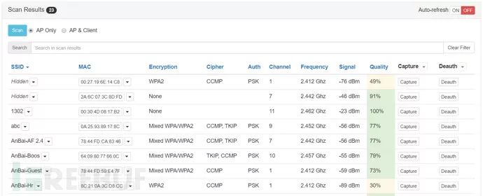 对于不同的网络,可以点击Capture进行抓包,也可以点击Deauth进行取消认证攻击