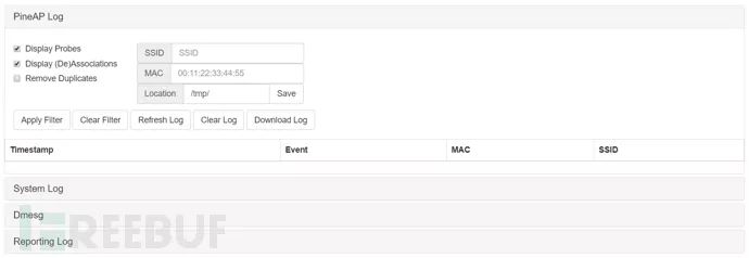 Logging模块共记录了 PineAP Log、System Log、Dmesg、Reporting Log四种日志