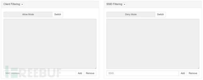 可以通过客户端MAC地址或SSID来执行过滤。支持“Deny”和“Allow”模式,可以使用Swith按钮进行切换