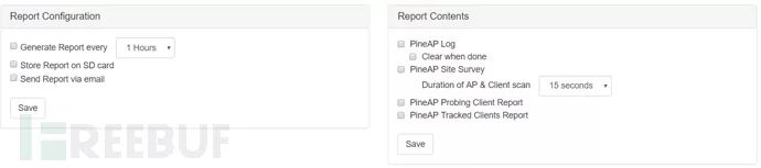 报告内容可选,包括PineAP日志(可以在生成报告后删除),PineAP Site Survey(可指定扫描时间)PineAP 探测和跟踪客户端报告。