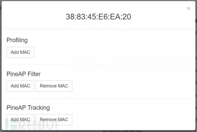 可以手动添加客户端,也可以在 Clients 或 Recon 视图中关联的MAC地址使用 PineAP Tracking Add MAC 按钮添加 Mac 地址到此模块中