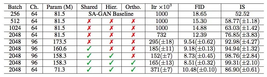 研究人员首先简单增加了基线模型的batch size,这样做的效果如下表所示。随着batch size逐渐变为基线的2倍、4倍、8倍,模型的FID不断下降,IS不断增加,至8倍时,BigGAN的IS较SAGAN已经提高了约46%。对于这个结果,他们提出的一个猜想是更大的batch size意味着每个batch覆盖的模式更多,这为两个神经网络提供了更好的梯度。
